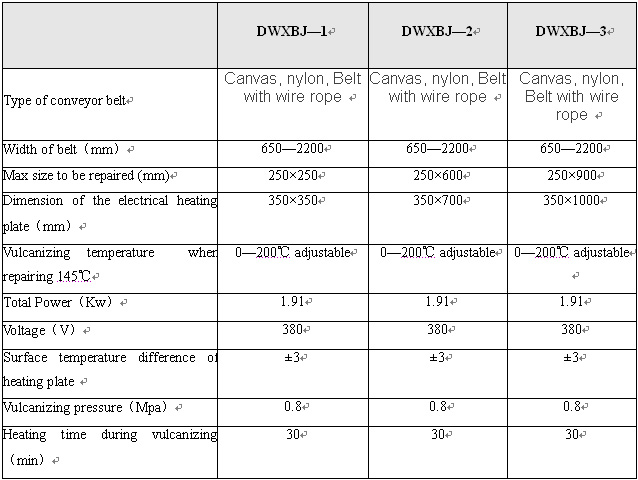DWXBJ-1 Electrical Conveyor Belt Repair Machine is mainly used to repair the small area broken belt and restore the broken core layer. It's repairing a spot or a piece of belt. Its characteristics are: simple structure, light in weight, operate easily and lower the cost relying on the help of cross beam of vulcanizer machine, as it's the same operating method with curing machine.